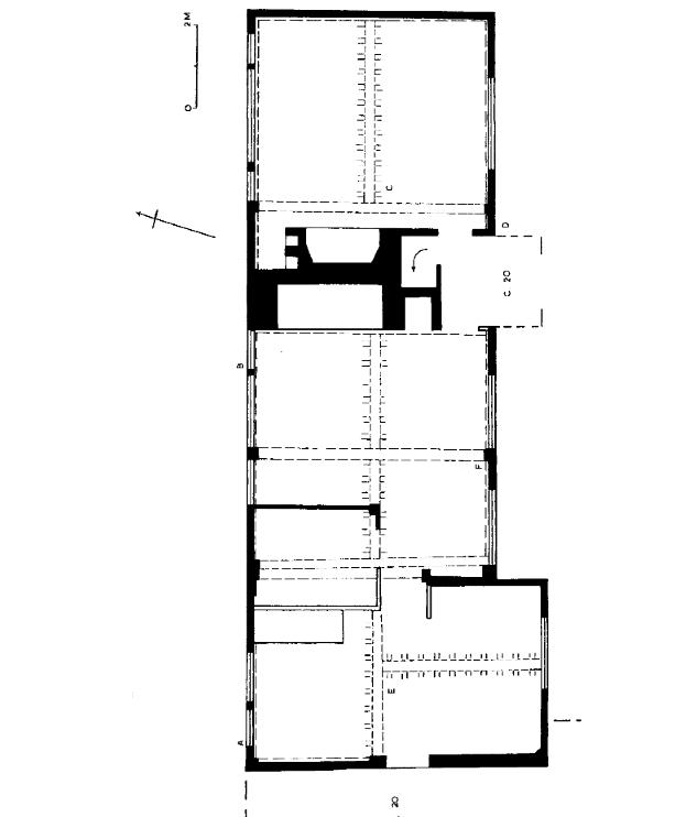 为了在不呛死客人的前提下使散热更加有效,烟囱式的耐火结构围着中心火坑而建,把烟气排出室外。下图是 16 世纪时的一所临时房的平面图。如图所示,背靠背的火炉打破了传统开放式厅堂的建筑结构。