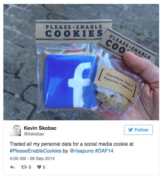 表演艺术家 Risa Puno 在一次布鲁克林艺术节上成功地使几乎一半参与者拿他们的个人数据(照片、手印、社保号等)交换一块可口的肉桂饼干。有些人甚至很自豪地发了推特。