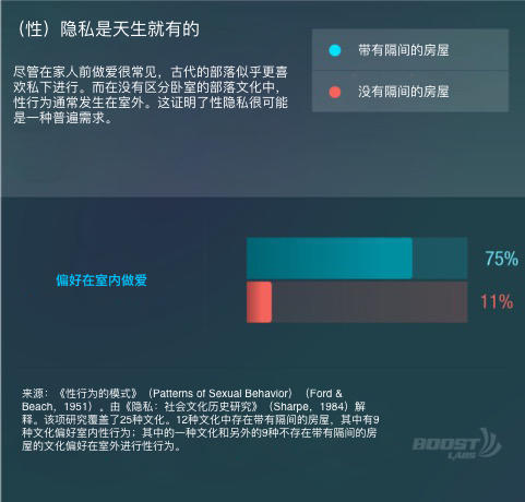 尽管在部落群体中(极度罕见,但其实隐私是源于本能的需求。部落时期已有证据表明人类更喜欢在私密环境下性交。如下图所示,12 个部落群体中,9 个部落的住所中有单独的父母卧室,因此人们更喜欢在室内性交。而在没有区分卧室的部落文化中,性行为通常发生在室外。)