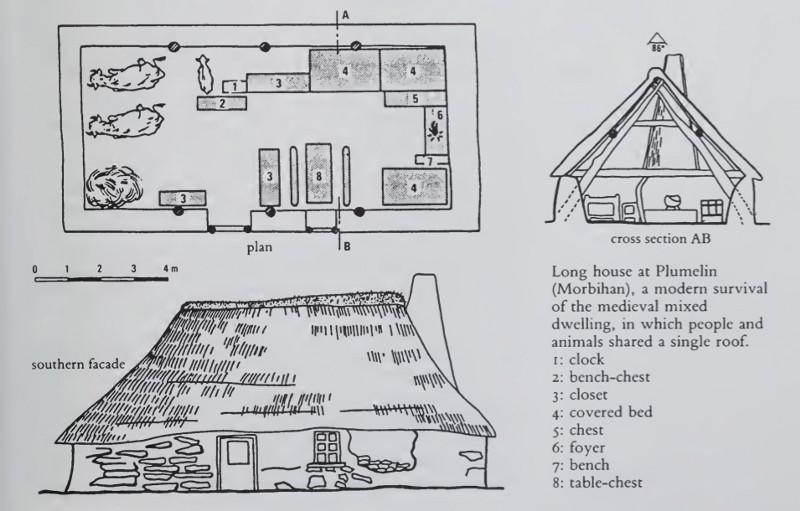 下图中,《指环王》风格的乡村长屋一度盛行近千年。从图纸中我们可以看到,动物与人一起睡在同一屋檐下,因为有且仅有一间房。