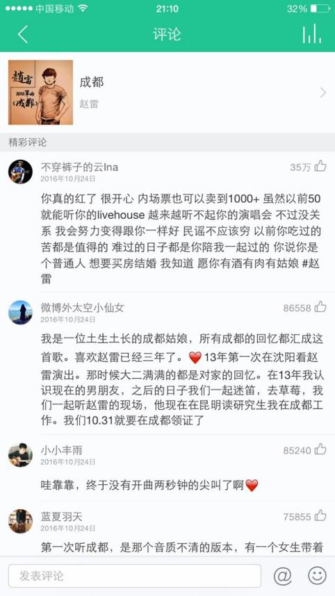目前,网易云音乐用户累计产生4亿条乐评,用户日均产生乐评数150万条。赵雷在《歌手》上火了之后,其单曲《成都》的评论数超过24万。而周杰伦《晴天》的评论数更是超过了134万条。