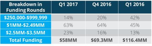 在2017这个重建时期,我们期望看到风险投资用更多的精力来评估投资并且付出更多的努力。除了专注于支撑现有投资的增长之外,投资者仍然坚定的关注那些强烈的表现出业务计划和盈利能力的公司。在过去五个季度整体交易环境受到打压的情况下,投资者不愿意花费大量的资金对市场趋势和公司进行审查。在纽约,第一季度交易总的23%的交易额在2.5亿美元和3.5亿美元之间,比第四季度增长了7%,同比增长了10%。而第一季度交易的63%的交易额下降到了1亿美元至2.5万美元之间。规模过小的种子投资(交易额小于1万美元)不太可能和目标公司合作一年以上,也就是会受到最大的损失。在2017年第一季度,还没有出现交易额小于50万美元的种子投资。
