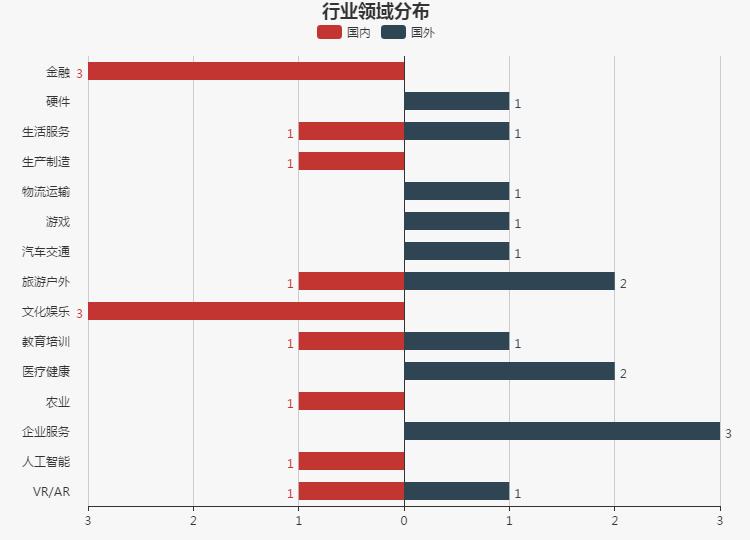 今日国内外共有27起融资事件,分布在15个行业中。国内13个项目获得融资,国外14个项目获得融资。从行业角度来看,国内融资主要分布在金融和文化娱乐领域(除生产制造外),各为3起融资事件,共占国内总融资笔数的46.2%;国外融资主要分布在企业服务领域,为3起融资事件,占国外总融资笔数的21.4%。