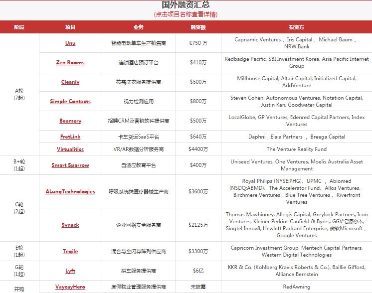ALung Technologies是美国的一家医疗健康公司,主要从事呼吸系统类医疗器械生产,通过去除二氧化碳并通过插入颈静脉或股静脉的小导管将氧气直接输送到患者的血液中起作用。近日,ALung Technologies完成3600万美元C轮融资,由Royal Philips和UPMC 领投, Abiomed、The Accelerator Fund、Allos Ventures、Birchmere、Blue Tree以及Riverfront 跟投。习平台,面向大学生群体及老师,以满足高校老师对丰富的互动性、适应性教育内容和线上教育的需求。目前主要涉及科学、医药、工程等领域。近日,Smart Sparrow获得400万美元B+轮融资,由Moelis Australia Asset Management领投, One Ventures和Uniseed参投。