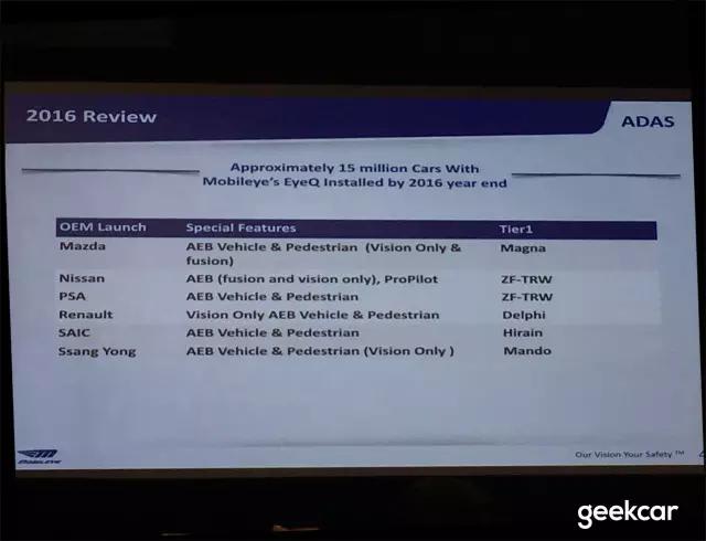 可以看到 Brian 大大肯定了 Mobileye 在数据方面的作用。作为一家在 ADAS 和计算机视觉领域混了将近 20 年的企业, Mobileye 已经拥有了充足的铺货量和汽车行业客户。EyeQ 芯片的出货量已经达到了 1500 万,其 AEB 解决方案也已经和众多主机厂签订了订单。