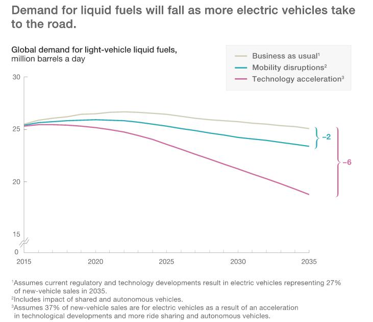 液体燃料全球需求(百万桶/天) 米色:继续目前的商业模式1 绿:包括流动性影响2 紫:科技加速发展3