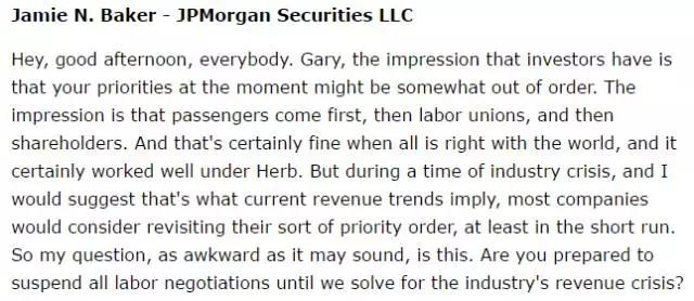 口碑不错的西南航空,在2016夏天的财报电话会议(earnings call)上,其CEO就被摩根大通分析员Jamie N. Baker质问:“看来你们没有优先考虑最重要的经营因素。投资者的印象是,你们把消费者放第一位了,然后是工会,最后才是股东。顺风顺水时这样做没问题,但在营收出状况时,短期内这个优先排序应该颠倒过来……你准备好暂停和工会的谈判了吗?”