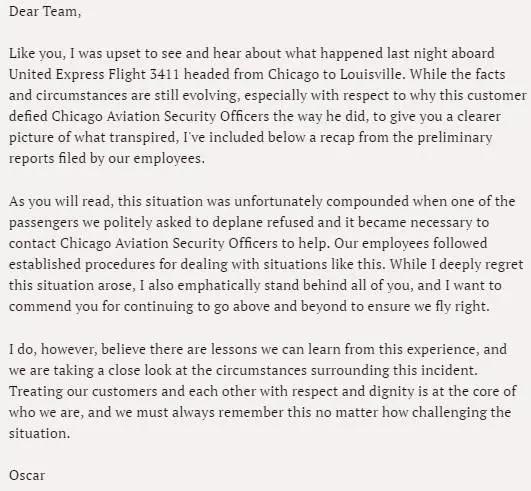 当天晚上,他又给美联航的员工发了一篇内部信件,可看作是另一种形式的公关回应,因为所有内部的回应总会被转发到网上。同样没有任何歉意,还力撑公司员工。他认为相关员工只是“执行已有程序”(Our employees followed established procedures);他对这件事只是“深感遗憾”(I deeply regret this situation arose);他强烈地站在员工的一边(I also emphatically stand behind all of you)。