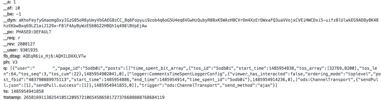 对于 Facebook 而言,元数据与原数据同等重要,也是推断你个人信息的依据之一。通过 Chrome 浏览器上的开发者工具,我们很容易看到以 xhr 形式从客户端传送到 Facebook 后端的大量数据。我并不是前端高手(但很乐意与任何一位交谈,探索其他可以提取到的数据),但从下图可以看出, Facebook 记录了你花费在某个未知动作上的时间,可能是如 Facebook 此前报告的,在网站停留的时间。