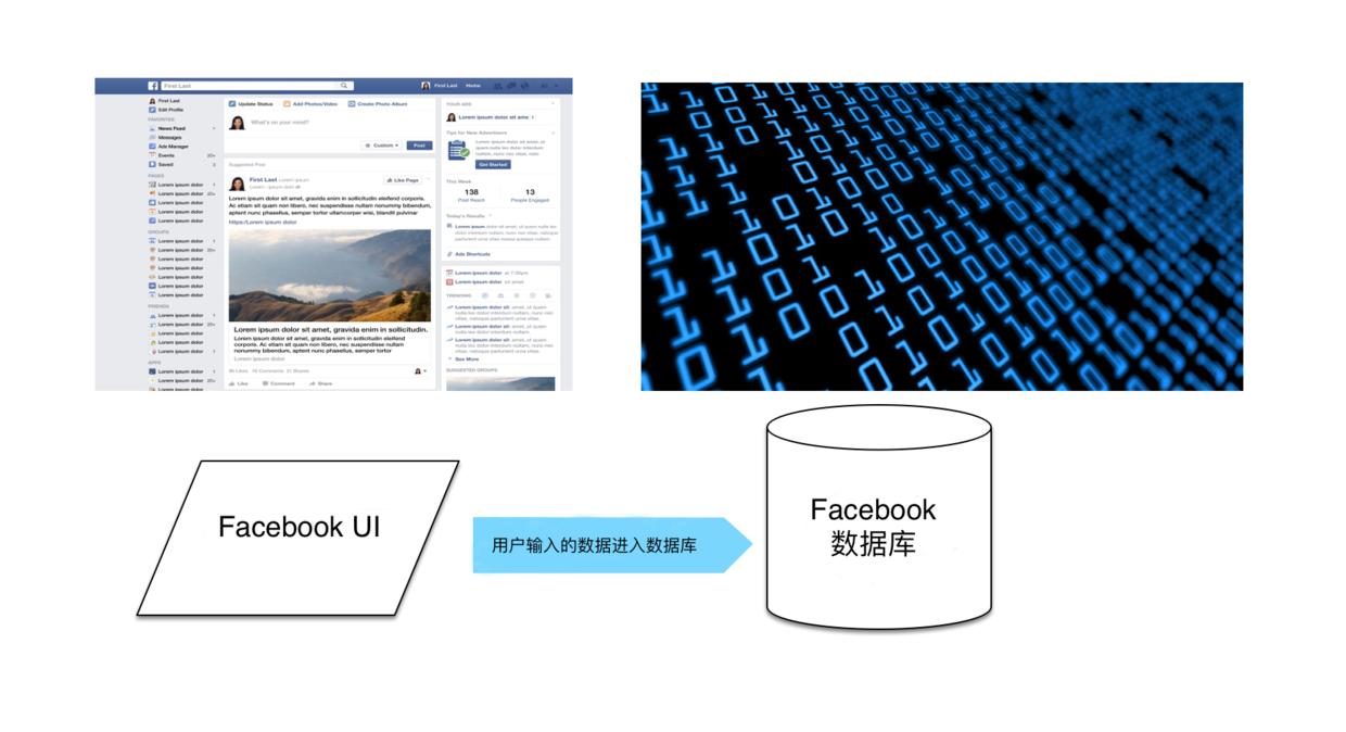 为了理解 Facebook 收集数据的过程,我做了如下的简易示意图。你从应用界面输入数据。这是属于前端的部分。