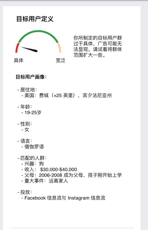 然后,这些信息被用来对 Facebook 用户进行广告投放。Facebook 所能进行的投放揭示出很多隐藏在背后的数据。比如,你不仅可以根据地理位置/年龄/性别/语言来进行投放,还可以根据爱好和生活阶段(比如,刚订婚、订婚六个月后,或者孩子刚进入学龄阶段)。即使是这么狭窄的定位,它仍然能覆盖到不少人(在我的例子中,是100到200人)。