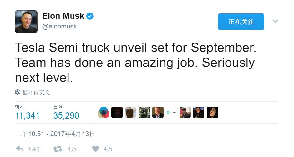 Tesla Semi项目发布会还是值得期待的,在没有任何征兆的情况下,Musk突然发Twitter主动提及:“Tesla Semi卡车会在9月发布,我们的团队取得了重大进展,完全不是一个级别的进展。”