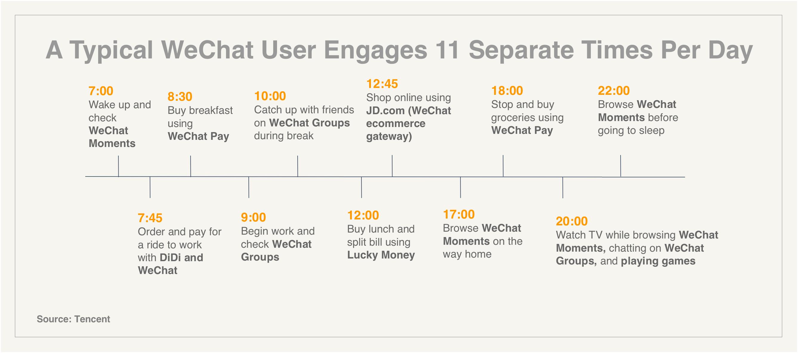 我们与腾讯(微信的母公司)的一个研究小组China Tech Insights建立了合作伙伴关系,了解到微信是怎么带动其8.89亿月活跃用户平均每天使用微信9至11次,每日总时长达50分钟以上。这个数字实际上相当于Facebook全系列app(包括Instagram、Facebook和Facebook messager)所有用户花费的每日时长总和。