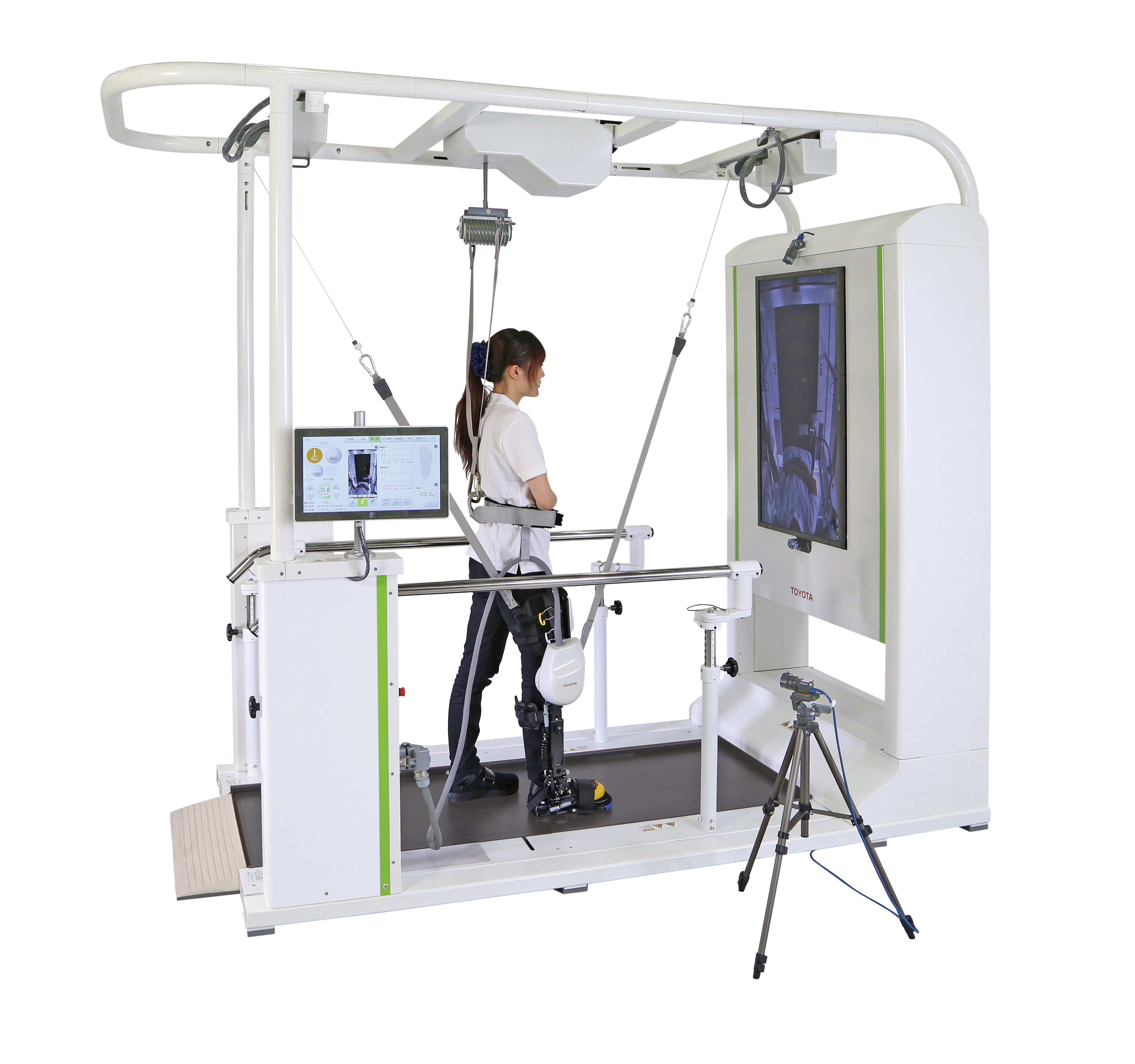当患者在器械上练习行走时,设备的传感器能够通过监控患者的行走模式,进行相应调整以适应患者,同时医务人员还可以通过触摸屏手动控制这个设备。