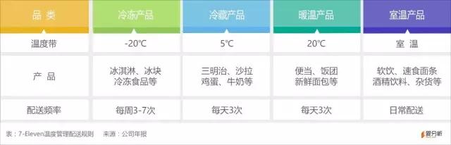 此外,为了最大限度保证产品品质,尤其是食品的新鲜度,7-Eleven对物流配送进行“温度管理”。根据不同产品对温度的要求,把产品分为冷冻、冷藏、暖温和室温四个温度带,进行温度隔离储存和配送。