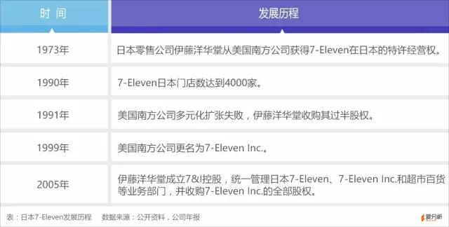 1927年,美国南方公司在售卖冰块的基础上增加鸡蛋、牛奶等商品,并延长营业时间,改为早上7点到晚上11点。1946年,店铺正式更名为7-Eleven。1964年,该公司开放7-Eleven特许加盟,并指导全球各区域的被授权方进行7-Eleven便利店的连锁经营,不断扩张版图。