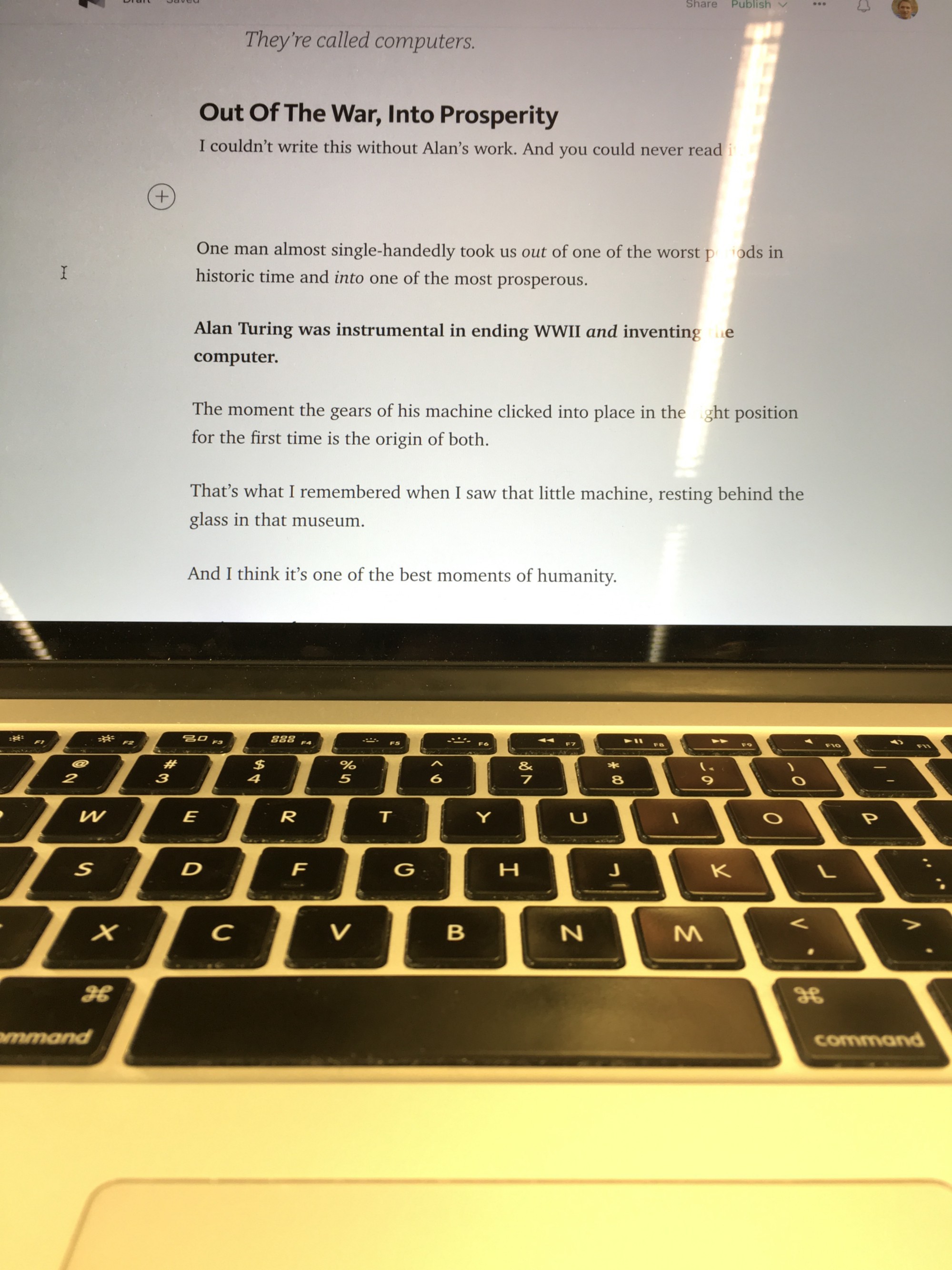 编者按:本文作者Niklas Goeke由于在博物馆看到了一个小的机器而回忆并讲述了艾伦图灵发明图灵机,从而击败恩尼格玛密码机并在二战中发挥了重要作用的事情。图灵被疑为同性恋者而被强行“治疗”,在被迫注射大量雌性激素后,不堪屈辱,吃沾染氰化钾的苹果自尽,他死去的桌边还剩下半个苹果,时年41。图灵的粉丝乔布斯把公司取名为苹果,并且以被咬了一口的苹果作为标志。