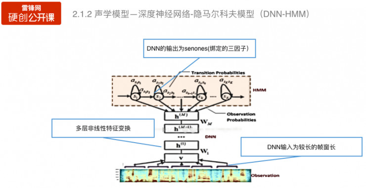 混合神经网络—隐马尔科夫模型是将混合高斯模型用深度神经网络进行替代,但是保留了隐马尔科夫的结构,对于输入端的扩帧和深度神经网络的非线性变换,识别率可以得到很大的提升。