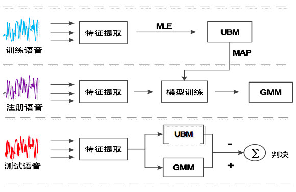 GMM的训练流程是:首先把训练语音进行特征提取,得到梅尔频率倒谱系数,然后生成一个通用背景模型,再通过MAP的方法得到说话人的模型。