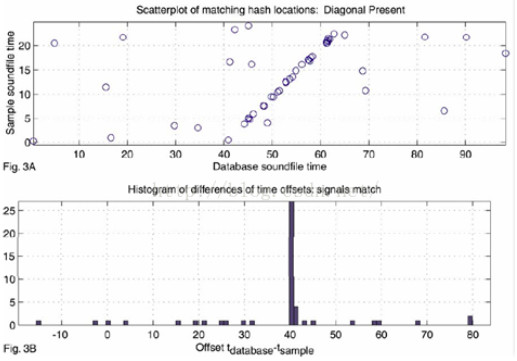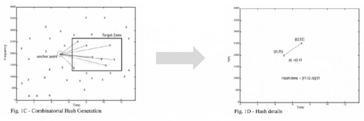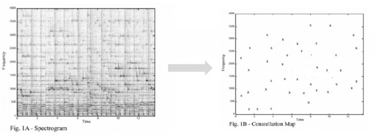 音频对比主要是从音频信号中提取特征,通过特征进行比对来检索。图中提取的过程就是通过频谱最大值点来建模。