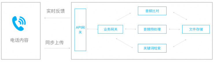 首先把通话录音通过API接口上传到关键词检索服务器上,关键词检索服务器的API网关对它的请求进行分类处理之后,移交给后续的业务网关来分发处理。首先要进行音频预处理,音频格式转码、语音降噪等,然后把处理后的文件存储;接下来,把结果反馈给业务网关,由音频比对对已知录音片段进行检测,如果有匹配这些录音片段就反馈结果——存在诈骗信息。