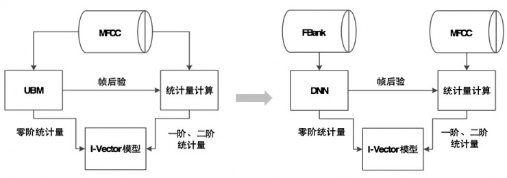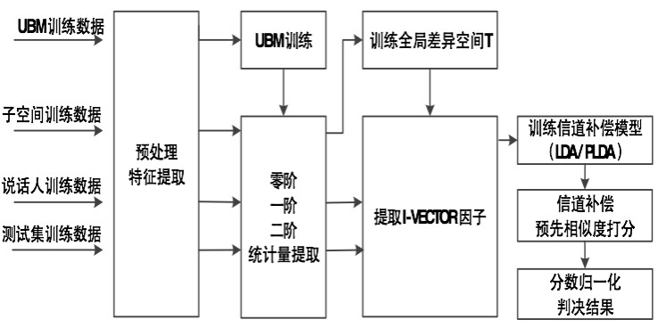 I-Vector在近两年有比较广泛的应用,它将说话人特征和信道特征统一建模,得到说话人特征通过信道补偿记录进行识别,有效解决了训练样本和实际检测样本存在信道不匹配的问题。