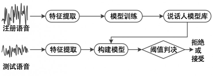 它的流程如下:首先对说话人的训练建模,把注册语音进行特征提取,模型训练之后得到说话人的模型库;在测试的时候,我们需要通过一个很短的音频去提取特征值,然后基于之前构建的模型进行阈值判断,判断出是集合内还是外,最终确认身份。