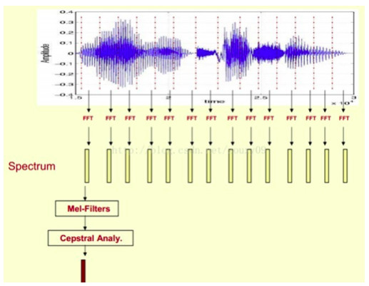 这张图显示的就是MFCC的提取过程,输入语音进行傅里叶变换,从中得到频谱,然后通过梅尔滤波器进行倒谱分析,再得到MFCC系数。