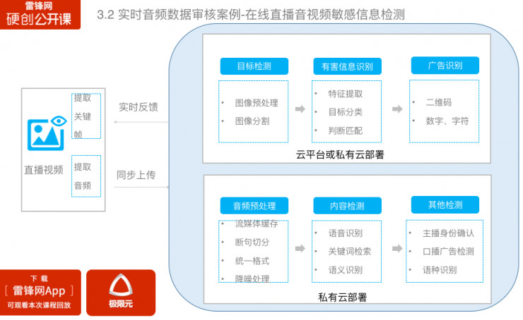首先会对直播中的音视频资源提取,分别交由图像处理模块和语音处理模块,针对图像数据我们要提取关键帧,针对语音数据,我们会把视频数据中的音频资源提取出来。