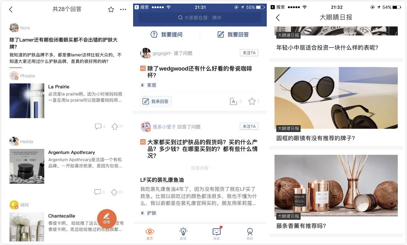 而在社区文化方面,相比知乎“……是怎样的一种体验”,大眼睛社区内的典型问答是,“除了LaMer,还有哪些干皮适用的贵妇面霜?”“除了Rimowa,还有哪些好看有高品的旅行箱?”“除了La Perla,还有哪些好看的Soft Bra ”。于小戈认为,这些用户厌恶烂大街,讨厌追逐明星的风格,在社区里他们有自己信赖的达人,追求真金白银换来的教训。