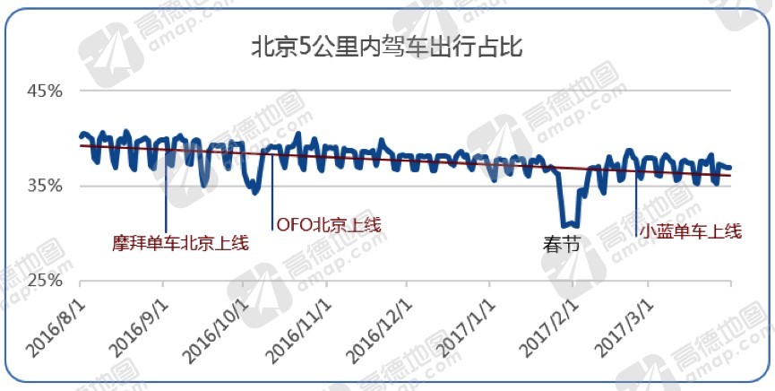 2017年4月17日,36氪日前获悉,高德地图联合小蓝单车(bluegogo)发布了第一季度共享单车的交通报告。报告显示,自2016年下半年多个品牌的共享单车陆续在北京、上海等城市上线之后,驾车用户5公里以下的出行占比,呈现出下降的趋势。除了城市绿色出行水平得到提升,从数据来看,城市中共享单车热点区域的拥堵程度也得到了缓解。