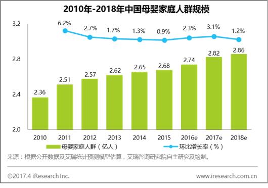 随着第三次婴儿潮和全面开放二胎新政的冲击,艾瑞咨询认为,预计到2018年年末,中国母婴家庭群体规模将达2.86亿,与2010年相比,将增长21.2%。母婴家庭人群的迅速扩张,以家庭为单位的母婴经济正在迅速崛起。
