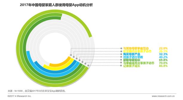 根据艾瑞调研,记录成长、家庭内分享动态及获取育儿知识是母婴App的三大主要使用动机。其中,86.8%用户使用母婴App的主要目的是记录孩子成长, 近80%用户通过母婴App分享孩子动态,母婴App已是母婴家庭分享的主流途径。