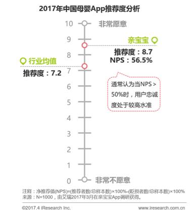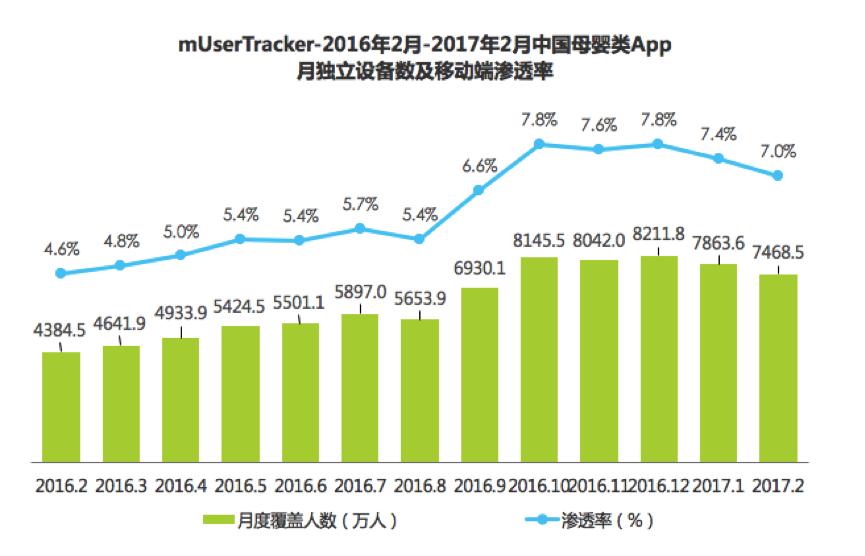 此外,移动化趋势也已然成主流,移动端使用时长占比88.2%,这两项趋势必将促进母婴App的高速发展。报告显示从2016年2月到2017年2月,母婴类App的月独立设备数整体涨幅超过70%。艾瑞数据显示,作为母婴头部企业App亲宝宝,截至2017年2月,月独立设备数已达到1051.3万,处于行业第一梯队。