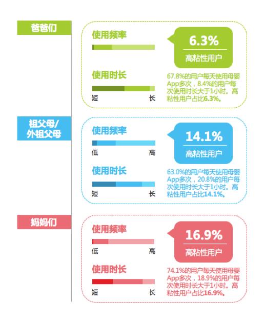 报告中,母婴家庭人群不同家庭角色的母婴App使用行为显示,爸爸人群中,67.8%的用户每天使用母婴App多次,高频长时的高粘性用户占比6.3%。祖辈人群中,63%的用户每天使用母婴App多次,高频长时的高粘性用户占比达到了14.1%。相比较于妈妈人群中,每天多次使用用户占比74.1%,高频长时的高粘性用户占比16.9%的比例,差距正在逐步缩小,爸爸和祖父母辈的育儿参与度正在凸显。