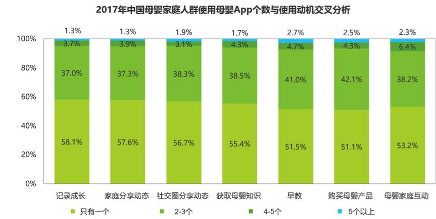 值得一提的是,艾瑞数据显示,以记录孩子成长和家庭内分享动态为动机的用户专一度更高,该部分用户只使用一个母婴App的比例分别达到58.1%和57.6%。而以早教和购买母婴产品为使用动机的母婴用户,只用一个母婴App的比例仅为51.5%和51.1%。