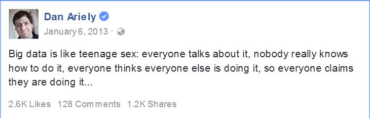 三年前,杜克大学行为经济学教授Dan Ariely还可以这样说,现在聊大数据已不再是纸上谈兵