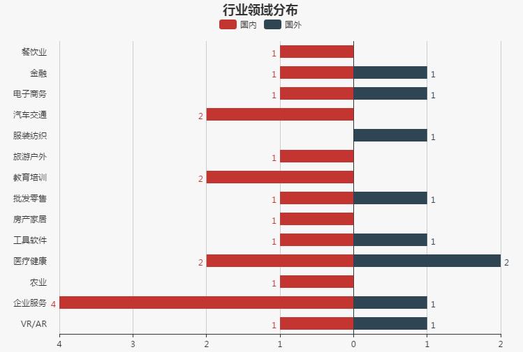 今日国内外共有28起融资事件,分布在11个行业中。国内18个项目获得融资,国外10个项目获得融资。从行业角度来看,国内融资主要分布在企业服务领域(除生产制造外),为4起融资事件,占国内总融资笔数的22.2%;国外融资主要分布在企业服务领域,为4起融资事件,占国外总融资笔数的40%。