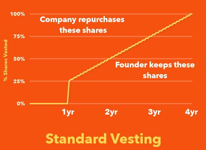 Vesting是创始人慢慢获得公司永久所属权的方式,对于创业公司来说,使用标准流程(Vesting)是很重要的。一般而言,Vesting期限是四年,加上一年的cliff。