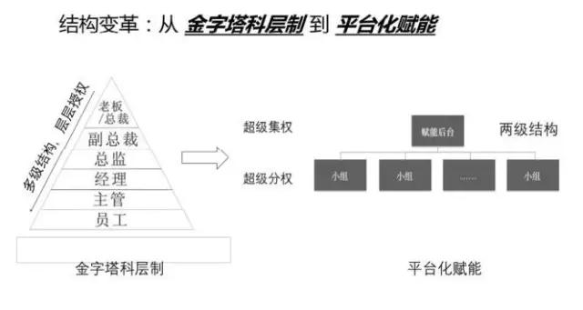 “赋能组织”其实是一个结构上的变革,以前叫“金字塔科层制”。一层一层,每层之间就靠人盯人、人管人,每层都有管理半径,但现在通过信息系统这个边界是无限的。