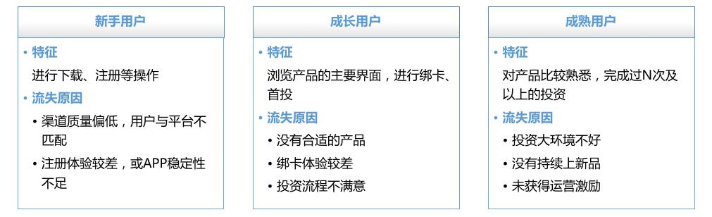 这时用户对产品有了基本的认知,正在进行投资准备工作(绑卡)或已经完成首投。这时发生流失,原因一般是: