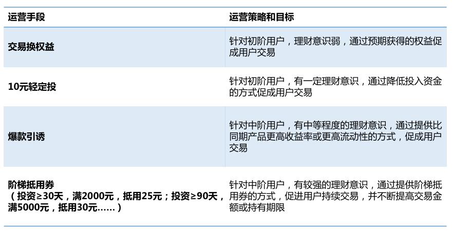 提升客单价。主要是针对定期类的理财产品,配套提供阶梯抵用券、满减券、返现等方式,刺激用户提高交易金额。