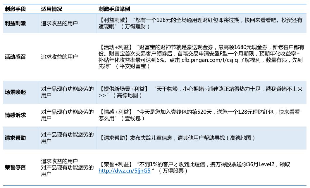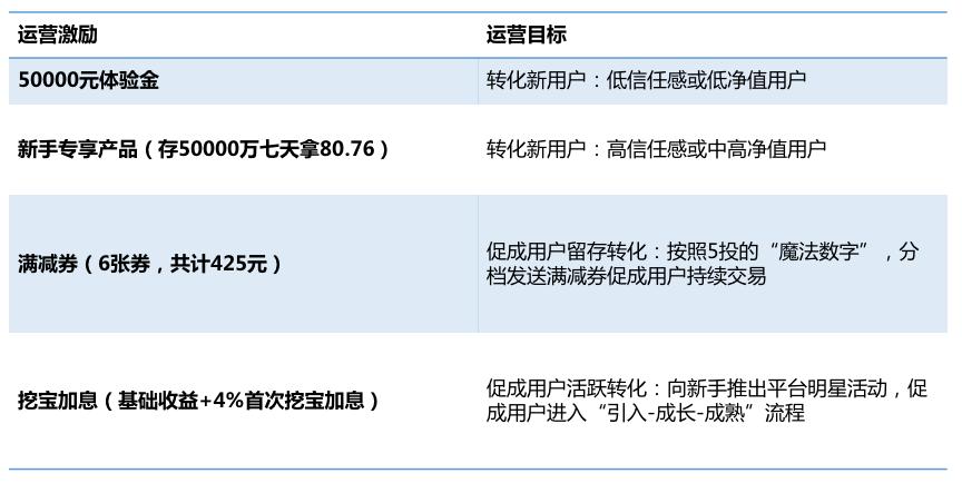 运营手段多种多样,本文所举例证大多是基于“利益激励”型案例,花费较高,收效也比较明显,包括送体验金、送券、送话费、分享加收益等。除此之外,运营手段还包括推送、内容运营、社群运营等手段,这些手段在运营中也同样重要。