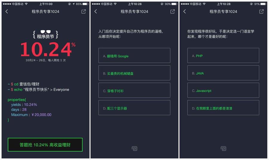 预算不足创意补。抓节日、跟热点都属于常规打法了。以平安壹钱包的1024程序员理财节为例。这个活动的玩法是:用户通过登录页面完成针对程序员的一系列题目,就能够获取购买年化收益率高达10.24%的专属理财产品。