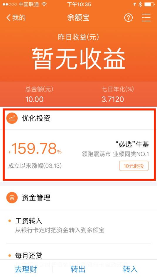 特性展示(B→R):在余额宝界面展示权益类基金,通过产品的历史回报水平吸引用户