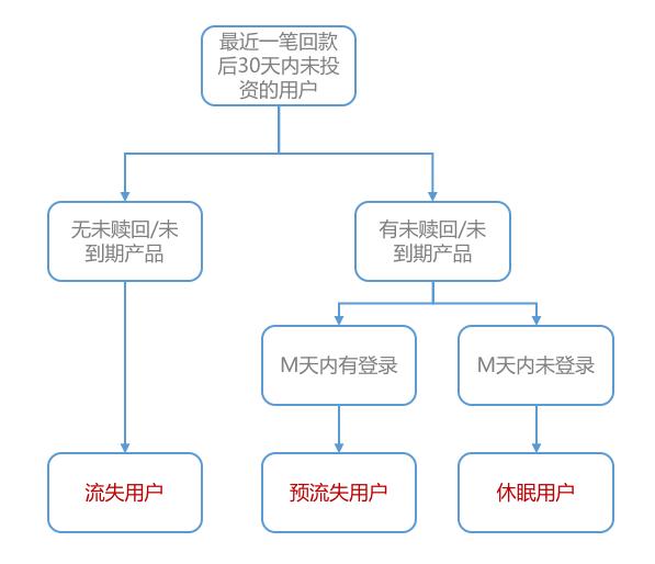 在最近一笔回款后的(30+M)天后,用户无登录(或其他关键操作、正向交易操作)发生,则认为该用户为休眠用户