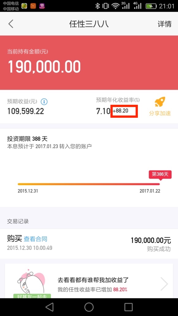 用户购买某一期的任性产品后,可通过微信好友/微信朋友圈/微博/QQ空间等方式分享给好友,参加收益加速