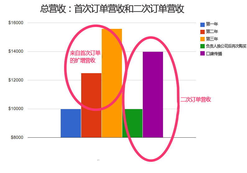 Jason Lemkin深知二次订单营收(Second Order Revenue)的重要性,而很多SaaS创业新手往往低估了二次订单营收。二次订单营收正是得益于早期客户成功工作,早期客户成功不仅能为你提供研究案例,还能为你带来更多的二次订单。二次订单主要由以下两部分构成: