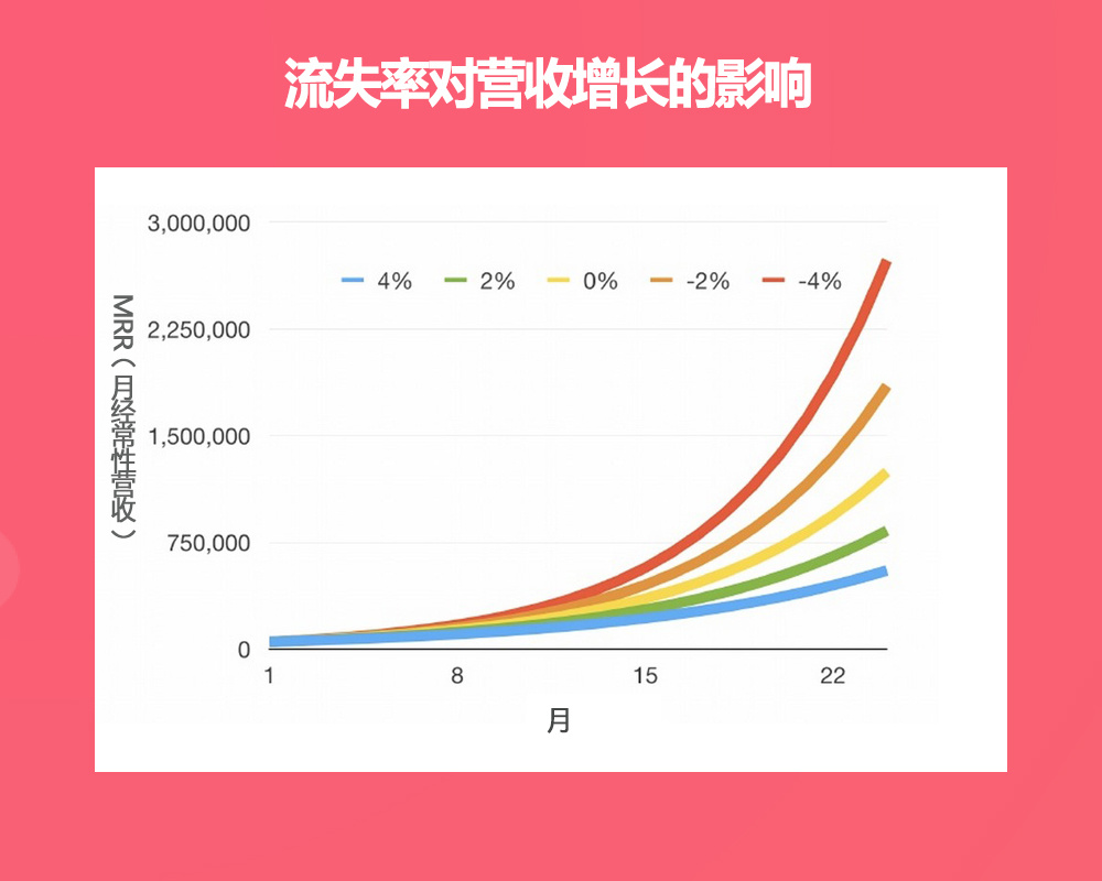 降低流失率对公司的整体营收的影响巨大。从下图可以看出,4%的流失率时的MRR为70万美元,而-4%流失率时的MRR则高达270万美元。