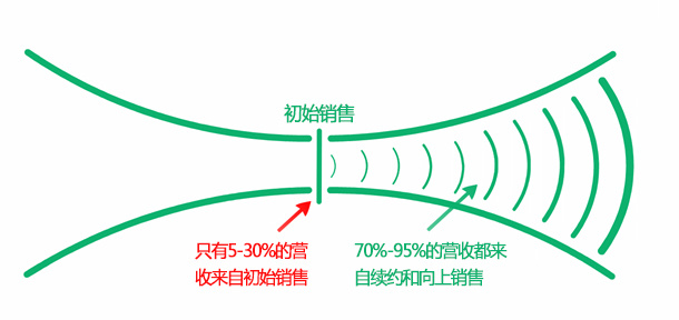 对于SaaS公司而言,公司的大部分营收都来自初始销售之后。正如下面这张图显示的那样,在一家SaaS公司的营收中,来自初始销售的营收只占总营收的5%-30%,其余70%-95%的营收都来自续约以及向上销售。